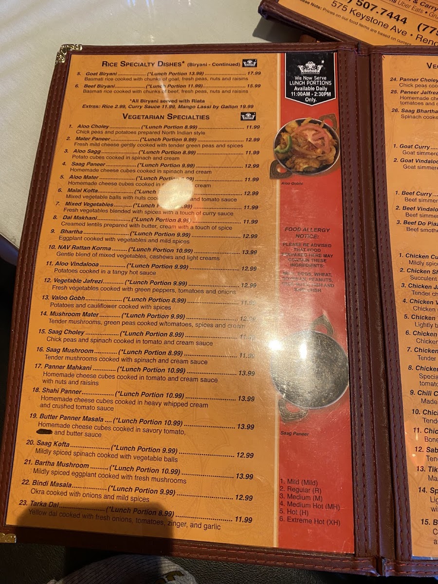 Vegetarian. Cheese cubes cooked in tomato, cream sauce with nuts and raisins.